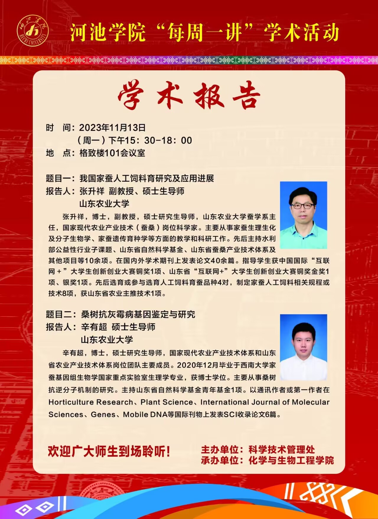 【学术报告】1.我国家蚕人工饲料育研究及应用进展 2.桑树抗灰霉病基因鉴定与研究