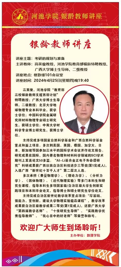 数理学院定于4月25日(周四)晚邀请银龄教师高英俊教授为大家开展考研规划辅导讲座。现将讲座有关信息通知如下: