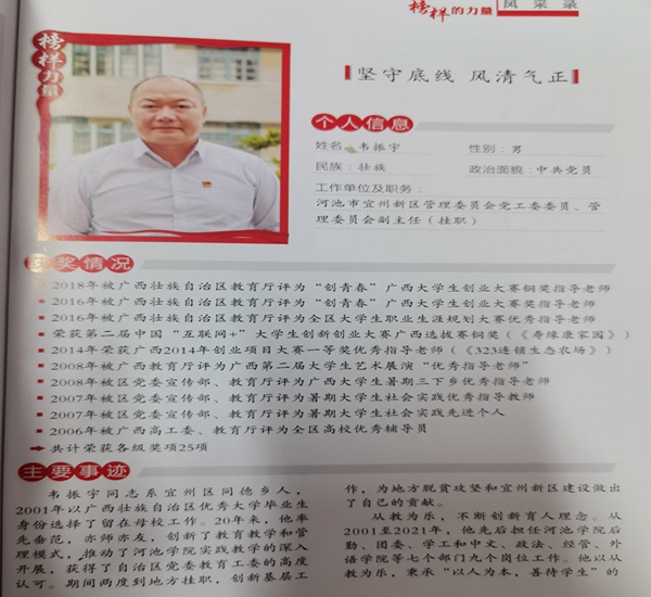 从课堂到实践,从学校到地方,韦振宇钟情于教育,努力把实践育人环节和创新管理模式转换到地方社会工作中,推动学校实践教学、人才培养与地方工作的融合。