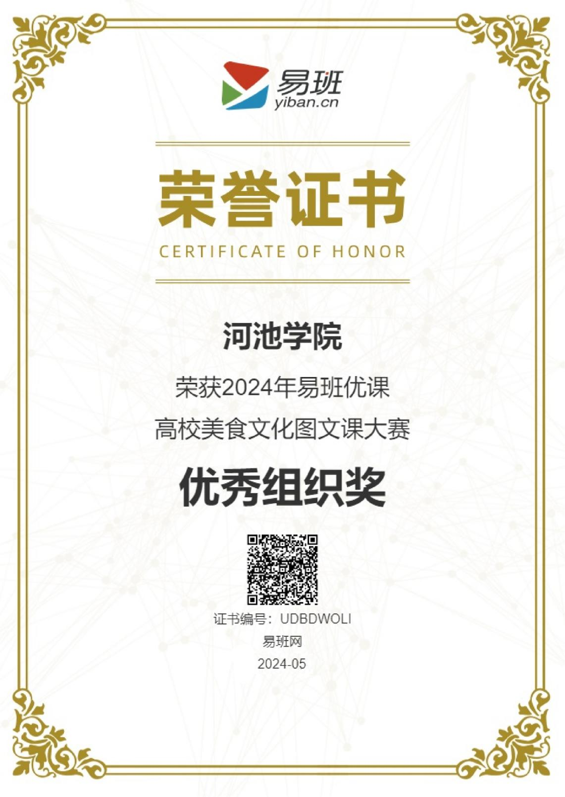 近日,由全国易班网举办的2024年度易班优课高校美食文化图文课大赛评选结果公布,Beat365官网荣获“优秀组织奖”荣誉。
