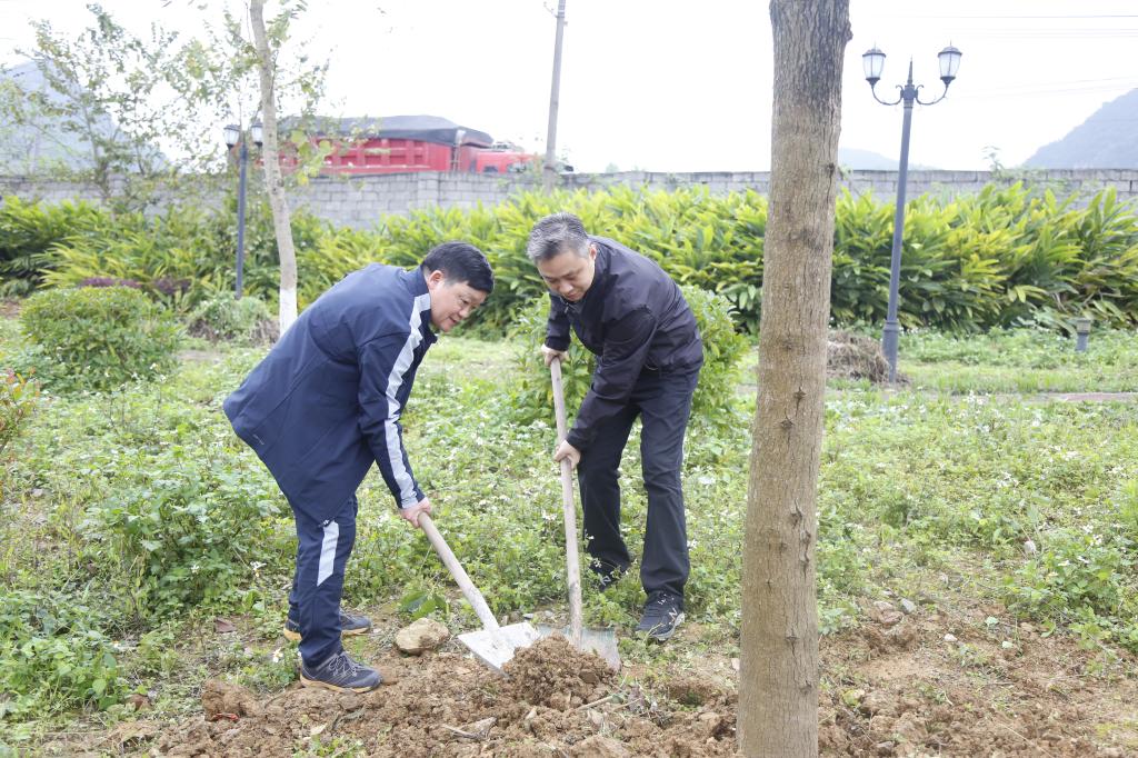 罗之勇(左)与徐迪克(右)一起为香樟树培土