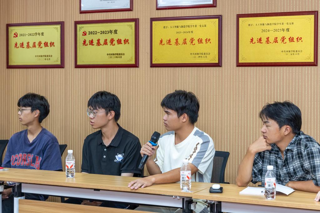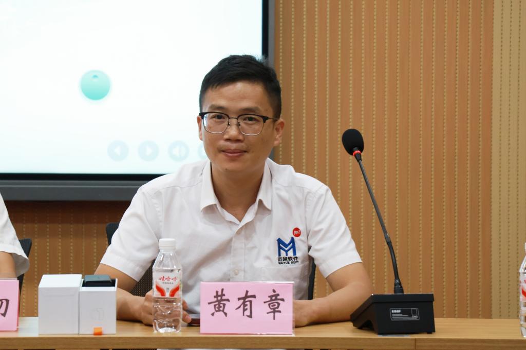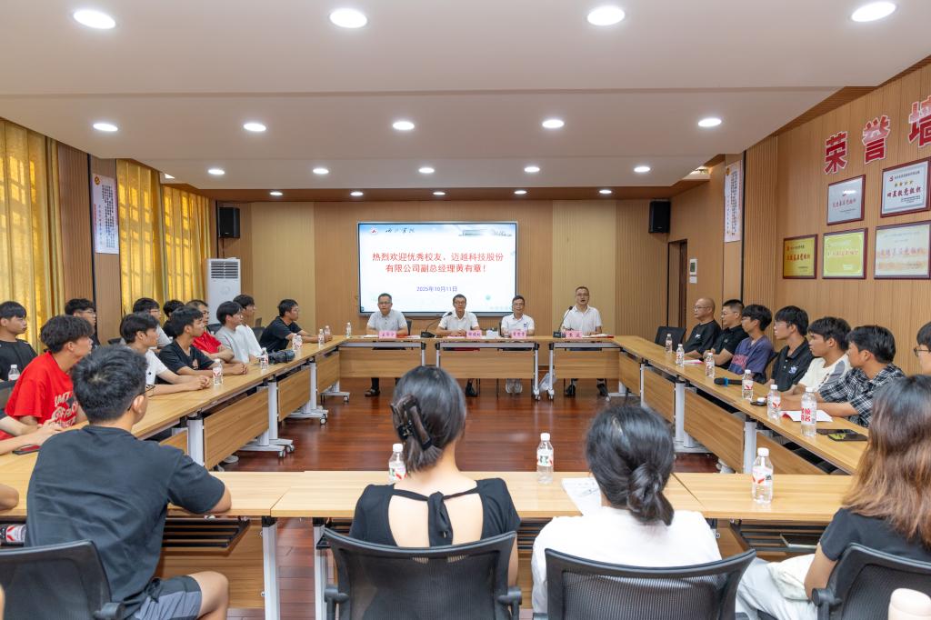 在综合楼207会议室,黄有章满怀深情回忆起校园的学习时光,坦言自己的成长离不开母校的滋养。他特别提及2011年在学校现代教育技术中心的勤工俭学体验,期间,老师们不仅指导他掌握多媒体设备运维与校园信息化系统的操作,还主动为他推荐计算机专业书籍、开放实训机房,鼓励他大胆探索编程、数据库等新领域,尤其鼓励他突破“机械专业生”的身份限制,广泛接触计算机相关知识与技术。他鼓励同学们在认真研习专业课程的基础上,踊跃参加社团活动、学科竞赛以及社会实践,以丰富自己的大学生活。在分享职业成长历程时,黄有章回顾了其团队研发的AI翻译眼镜在第22届中国—东盟博览会、中国—东盟商务与投资峰会上“出圈”过程,他表示,把握机会的关键有两个,一是“先做再说”的行动力,二是对行业趋势与地方优势的敏锐感知。