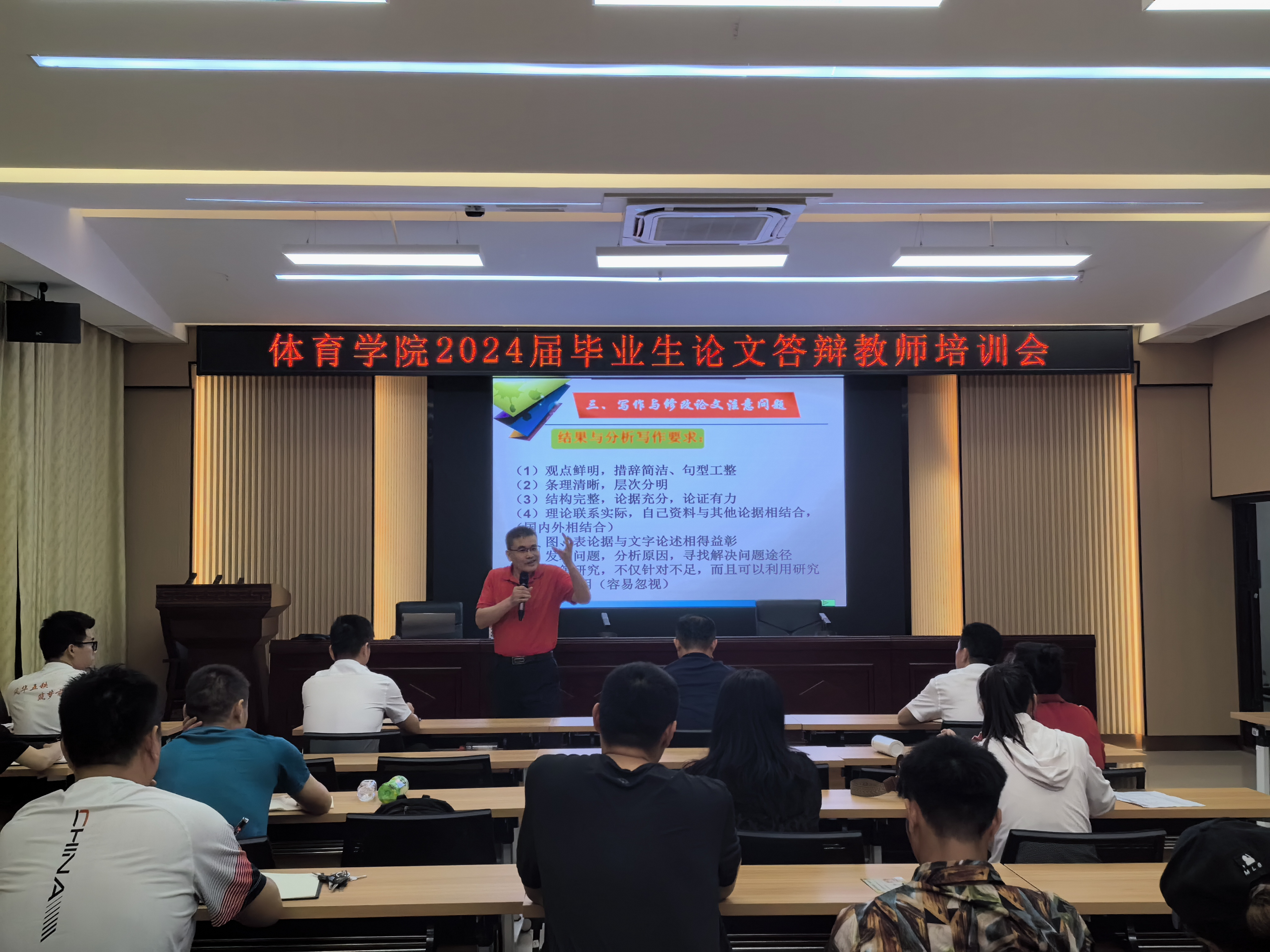 为规范体育学院本科毕业论文撰写要求,切实提升本科毕业论文质量,4月25日晚,体育学院召开2024届毕业生论文答辩教师培训会,邀请银龄教师彭贻海教授作《学生毕业论文答辩的关键要素与提问技巧》讲座。学院院长蓝建卓主持会议,全体教师参加培训会。