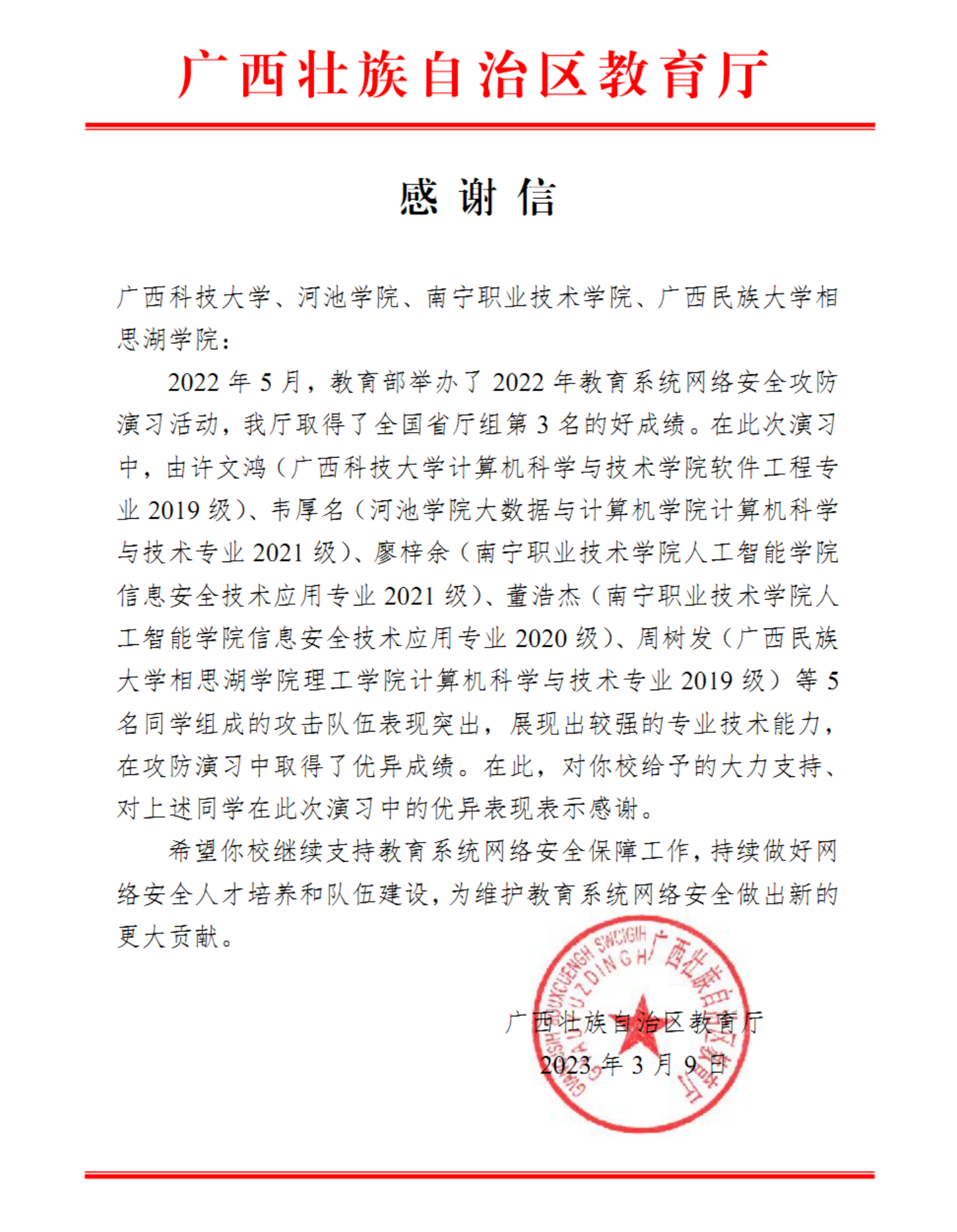 2023年自治区教育厅感谢信