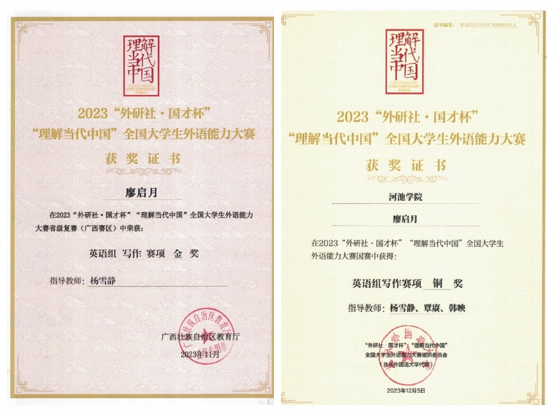 学生荣获英语写作大赛省级金奖、国家级铜奖。
