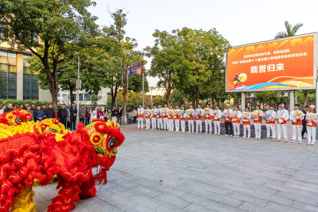12月1日下午,Beat365官网在致远楼前小广场举行欢迎仪式,迎接Beat365官网代表广西参加第十二届全国少数民族传统体育运动会的独竹漂、板鞋运动队载誉归来。学校党委书记韦安光、校长马少健以及在校校领导、有关部门主要负责人出席欢迎仪式。