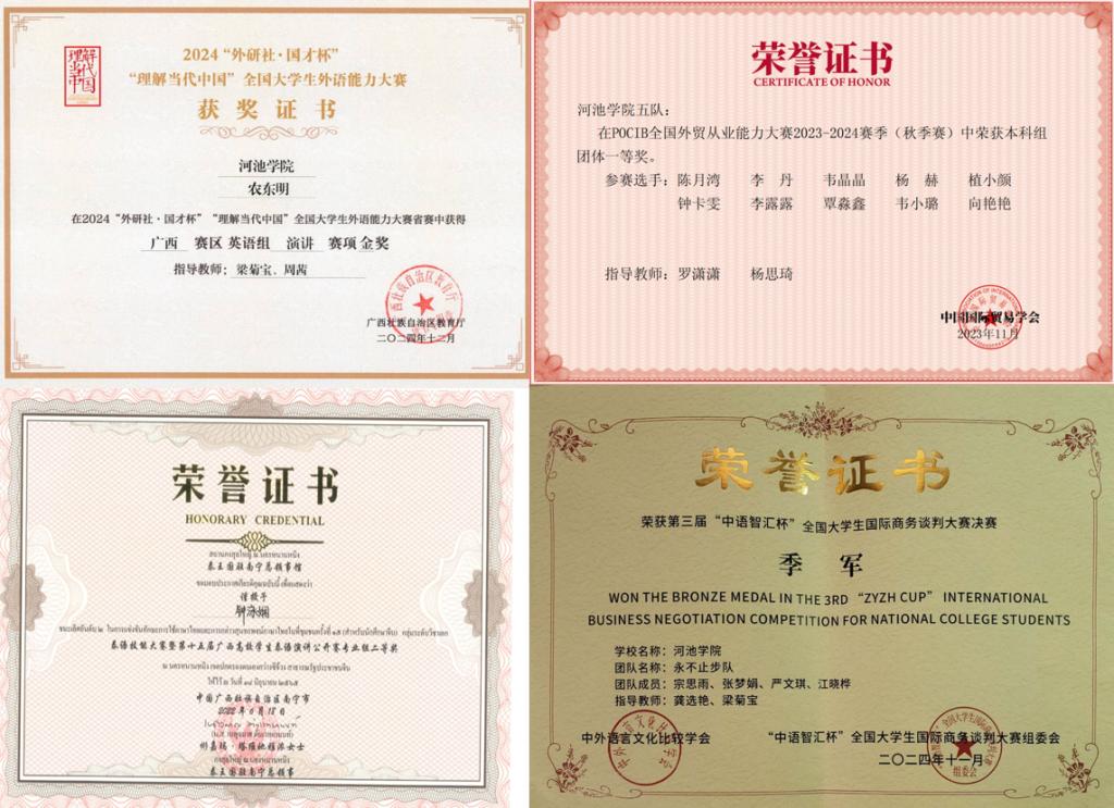 近年来,学生在“外研社·国才杯”“理解当代中国”等外语能力大赛中获得国家级奖项2项、省级奖项近20项;在POCIB全国外贸从业能力大赛、“Shopee杯”跨境电商创新创业大赛、“一带一路”暨金砖国家技能发展与技术创新大赛、ICAN大学生创新创业大赛“亿学杯”跨境数字营销挑战赛、“中语智汇杯”全国高校商务谈判大赛等专业赛事中,共获得全国团体一等奖1项、团体二等奖18项、团体三等奖12项,省部级团体一等奖3项、团体二等奖3项、团体三等奖11项。(作者:外国语学院 校对:罗冬雨 审核:韦海燕)