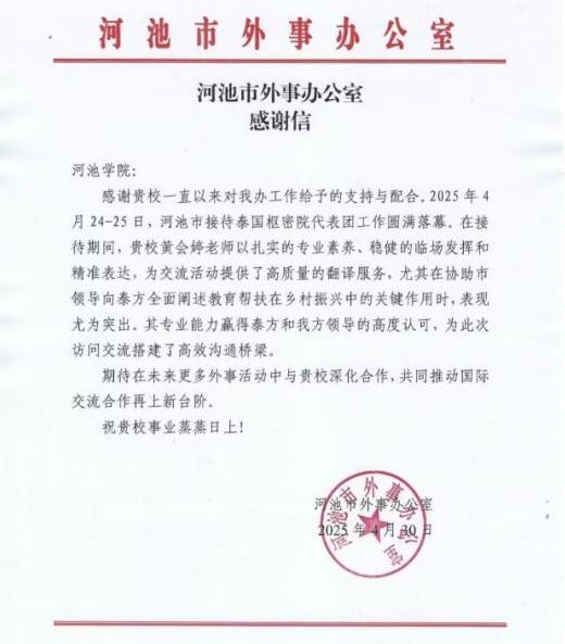 学院泰语教师在外事活动中担任翻译,河池市外事办发来感谢信