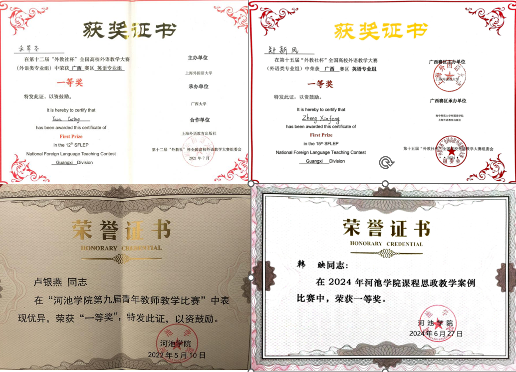 近年来,学院8门课程获批校级课程思政示范课程立项建设项目,2项课程思政项目获得省级立项。同时,学院正在推进校级第三批“一院一品”校园文化品牌创建项目“河池文化融入外语教育的创新实践”的研究与实践,力争高质量结题。