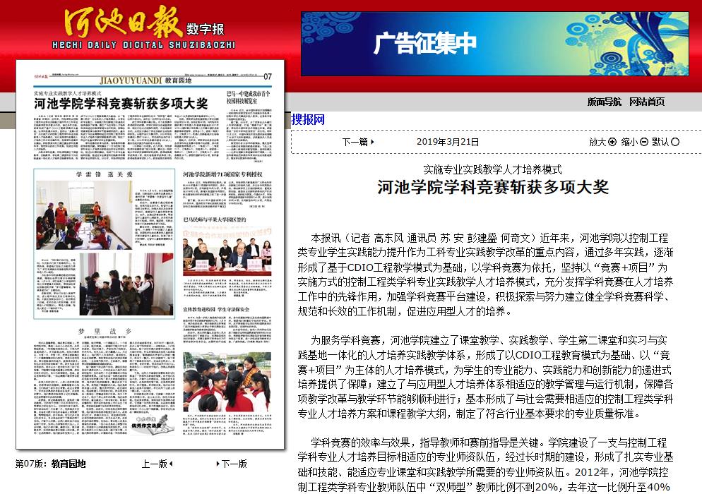 03-212019【河池日报】实施专业实践教学人才培养模式 Beat365中文官方网站学科竞赛斩获多项大奖河池日报:http://hcrb.hcwang.cn/html/2019-03/21/content_191266.htm?tdsourcetag=s_pcqq_aiomsg新河池客户端:https://h5.newaircloud.com/news_detail?newsid=6715823_hcrb本报讯(记者高东风通讯员苏安彭建盛何奇文)近年来,Beat365中文官方网站以控制工程类专业学生实践能力提升作为工科专业实践教学改革的重点内容,通过多年实践,逐渐形成了基于CDIO工程教学模式为基础,以学科竞赛为依托,坚持以“竞赛+项目”为实施方式的控制工... -