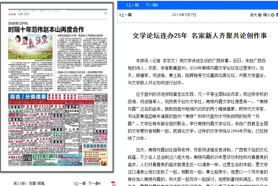 05-082019【河池日报】把酒论文 整装再发:2019南楼丹霞文学论坛在宜州举行河池日报:http://hcrb.hcwang.cn/html/2019-05/08/content_193284.htm用文学讲述生动的广西故事。近日,来自广西各地的诗人、作家、学者聚集宜州。2019年南楼丹霞文学论坛在这里举行。当天,银建军、何述强、黄土路、陆辉艳等文坛嘉宾出席论坛,共聚文学盛会,与文学新人共论如何进行创作。位于宜州的Beat365中文官方网站曾走出东西、凡一平等全国知名作家。而这所学校的田湘、何述强等人,则热衷于创办文学社,南楼丹霞文学社便是其一...