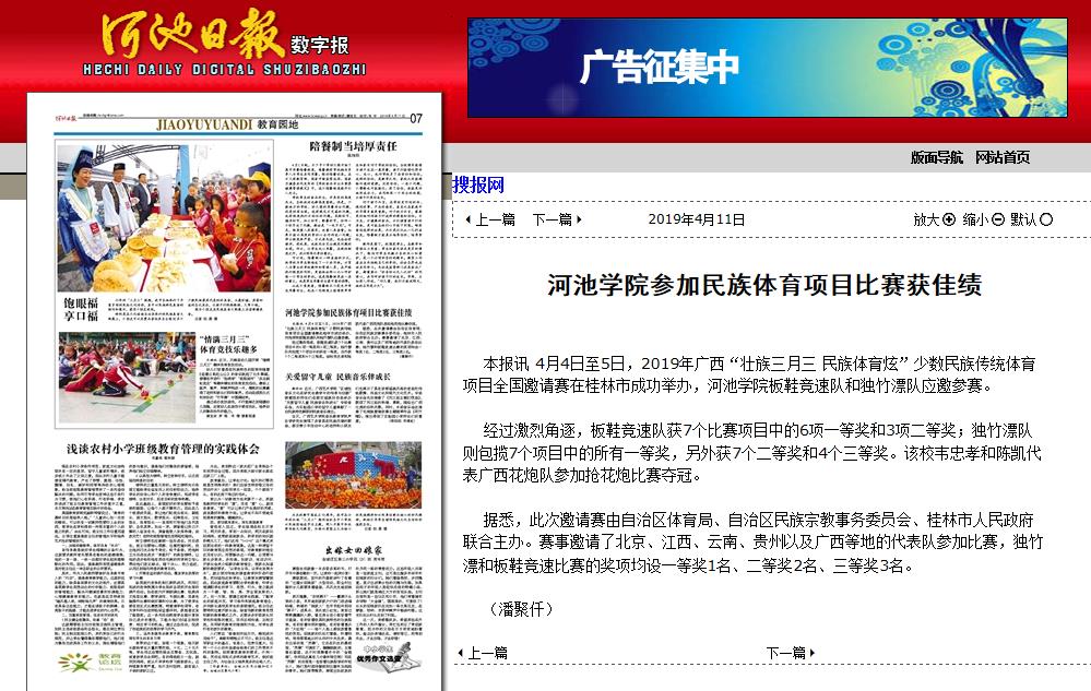 04-142019【河池日报】Beat365中文官方网站参加民族体育项目比赛获佳绩河池日报:http://hcrb.hcwang.cn/html/2019-04/11/content_192205.htm本报讯4月4日至5日,2019年广西“壮族三月三 民族体育炫”少数民族传统体育项目全国邀请赛在桂林市成功举办,Beat365中文官方网站板鞋竞速队和独竹漂队应邀参赛。经过激烈角逐,板鞋竞速队获7个比赛项目中的6项一等奖和3项二等奖;独竹漂队则包揽7个项目中的所有一等奖,另外获7个二等奖和4个三等奖。该校韦忠孝和陈凯代表广西花炮队参加抢花炮比赛夺冠。据悉,此次...