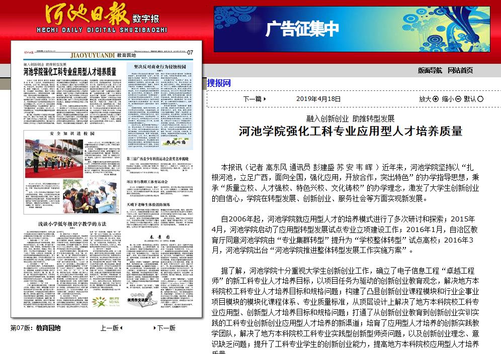 04-182019【河池日报】融入创新创业 助推转型发展:Beat365中文官方网站强化工科专业应用型人才培养质量河池日报:http://hcrb.hcwang.cn/html/2019-04/18/content_192510.htm本报讯(记者 高东风 通讯员 彭建盛 苏安 韦晖)近年来,Beat365中文官方网站坚持以“扎根河池,立足广西,面向全国,强化应用,开放合作,突出特色”的办学指导思想,秉承“质量立校、人才强校、特色兴校、文化铸校”的办学理念,激发了大学生创新创业的自信心,学院在转型发展、创新创业、服务社会等方面实现新发展。自2006年起,Beat365中文官方网站就应用型人才的培养模式进... -