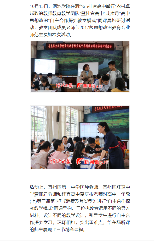 10-172019【河池日报】Beat365中文官方网站组织的这场活动刷新认识,原来高中思想政治课还能这样上10月15日,Beat365中文官方网站在河池市桂宜高中举行“农村卓越政治教师教育教学团队”暨桂宜高中“共建月”高中思想政治“自主合作探究教学模式”同课异构研讨活动,教学团队成员老师与2017级思想政治教育专业师范生参加本次活动。活动上,宜州区第一中学匡玲老师、宜州区红卫中学罗丽君老师和桂宜高中莫庆彬老师对高中一年级(上)第三课第1框《消费及其类型》进行“自主合作探究教学模式”同课异构。三位执教者运用不同的导入材料,设计不... -