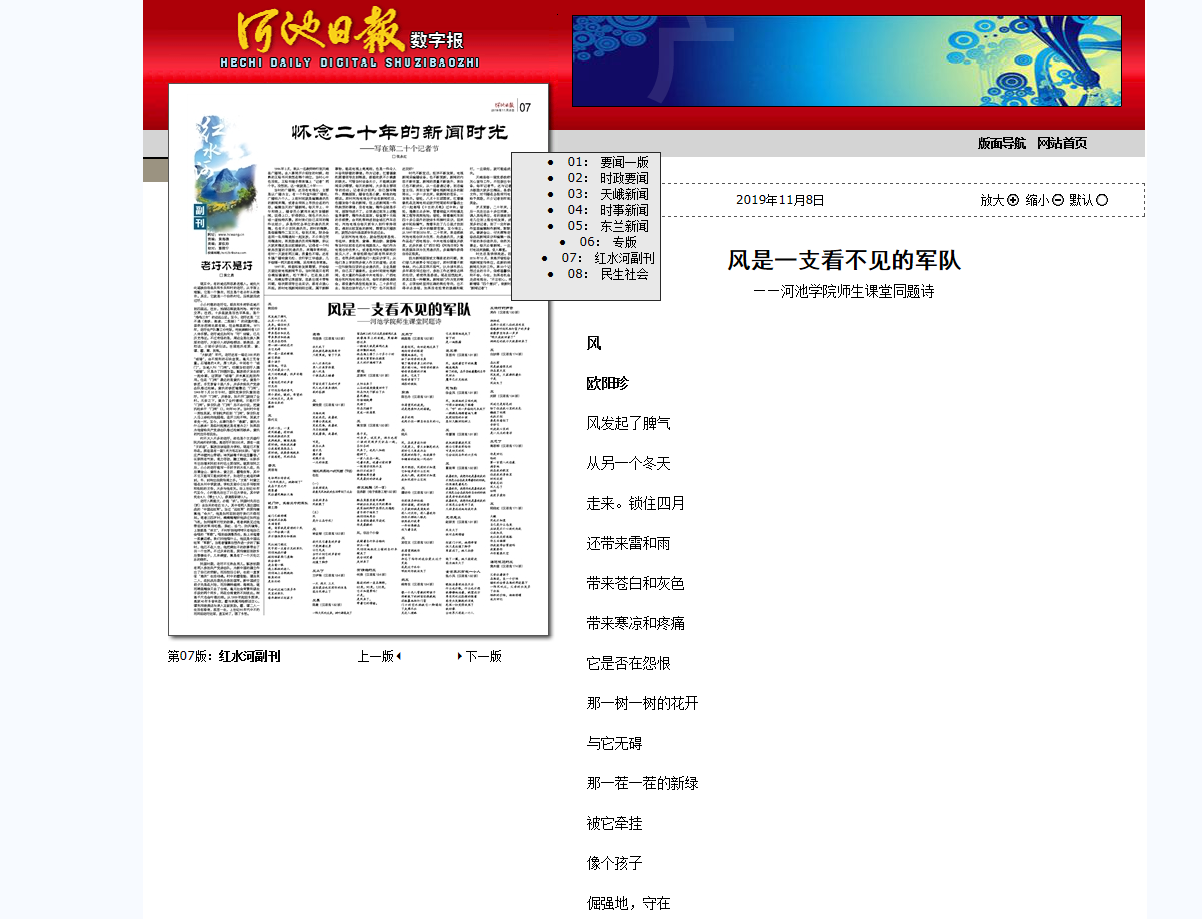 11-082019【河池日报】风是一支看不见的军队 ——Beat365中文官方网站师生课堂同题诗河池日报:http://hcrb.hcwang.cn/html/2019-11/08/content_201989.ht -