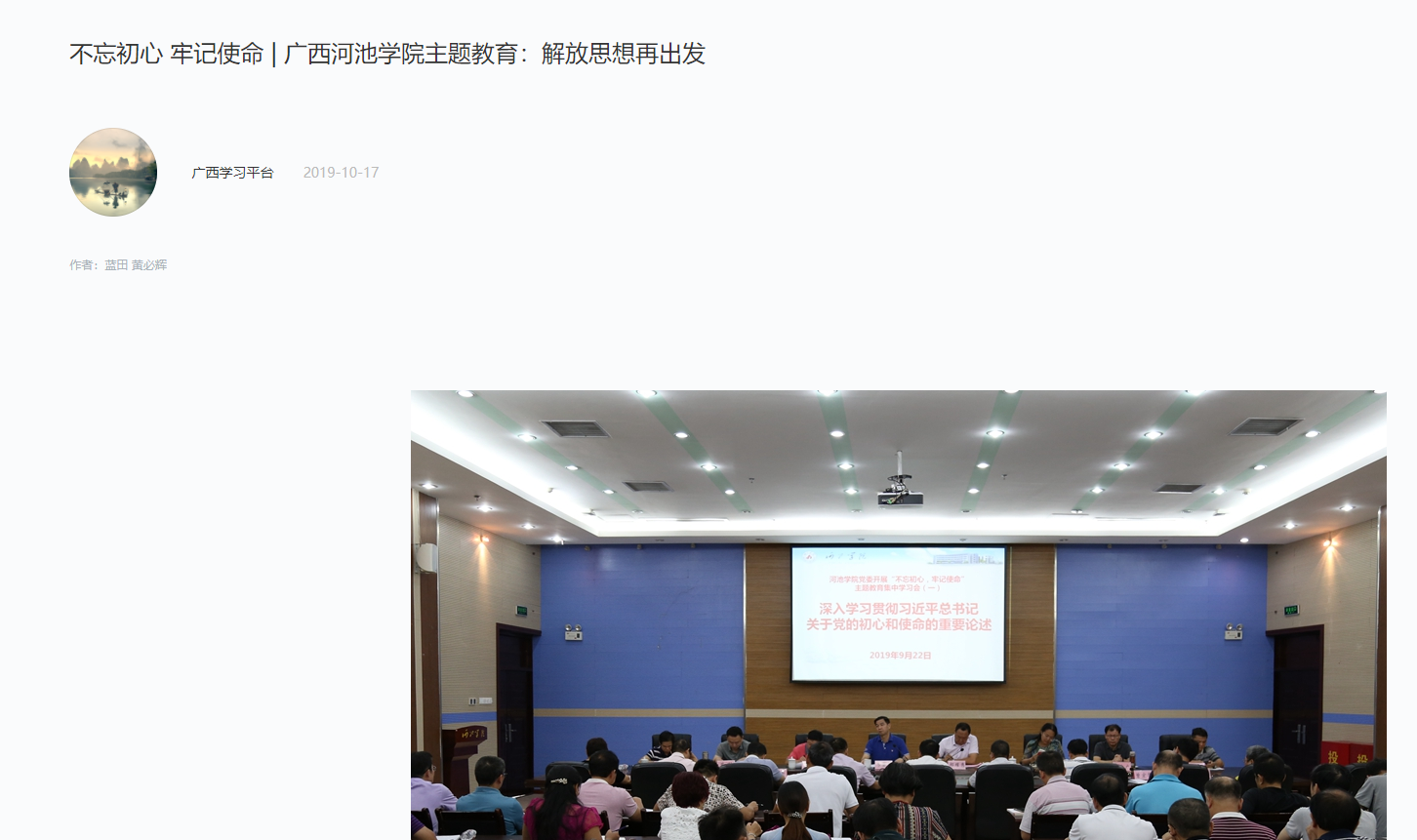 10-182019【学习强国】不忘初心、牢记使命|Beat365中文官方网站主题教育:解放思想再出发学习强国:https://article.xuexi.cn/articles/index.html?art_id=2973777456337726355&study_style_id=feeds_default&source=share&share_to=wx_single截至2019年10月8日,广西壮族自治区Beat365中文官方网站组织了4次党委常委会、8次党委理论学习中心组(扩大)集中学习会、2次全体处级干部学习会、2次党史专题教育活动,“不忘初心、牢记使命”主题教育取得良好成效。坚持“四个抓手”,全面推进主题教育深入开展Beat365中文官方网站坚持以“党员活... -